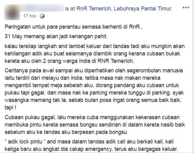 根据一名网民在脸书分享其自身经历,指他在回乡途中到淡马魯(Temerloh)休息站休息时,有数名印裔及马来男子注视着他一举一动,甚至选择坐在他隔壁的桌子位,企图用眼睛去迷魂该名网友,不过该名网友并没有与对方眼神交流。