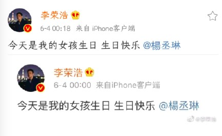 李荣浩为女友庆生屡失败 杨丞琳甜蜜用爱心回应 4 Jun , 2019 | 娱乐前线 6月4日是杨丞琳35岁的生日,零点刚到李荣浩就发文甜蜜为女友庆生“今天是我的女孩生日,生日快乐@杨丞琳”,但却屡屡发布失败,最后他无奈写道:“从12:00开始,发了很多次都不成功,我不发了行了吗!!!!!!!!!!!”稍晚,杨丞琳转发他的微博安慰道:“我收到了,不气不气”,并配上当时的截图和爱心表情。 网友纷纷评论道:“这什么神仙恋爱!”“我的天哪这两人太甜了吧!”“哈哈哈哈哈哈把人整奔溃了”“暴躁老哥在线打感叹号!”“哈哈哈哈知道啦!祝你的女孩生日快乐!” 分享