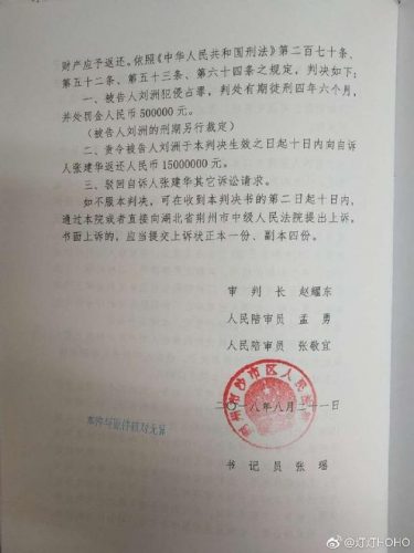据陆媒《娱理》报导,刘洲9日17:35分在北京被逮捕,暂时被羁押在石景山分局鲁谷派出所,并以不方便受访婉拒外界询问。他涉及侵占投资人1500万,对方是黄子韬「龙韬娱乐」的合伙人张建华,一审被判处有期徒刑4年6个月,除了需归还侵占的1500万,还被处罚金人民币50万(约台币230万元),由于全案还可上诉,官司缠讼1年,疑似维持一审原判结果。