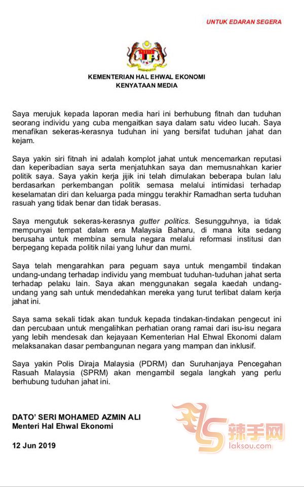 “我绝不会屈服于这些懦弱、试图分散公众对国家问题的注意力的行为;我也对警方和反贪会有信心,采取必要措施处理这恶意的指控。”