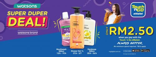 妈妈们看这里!购买Watsons特定产品只需RM2.50! 16 Jun , 2019 | 吃喝玩乐 【好康】Watsons和一触即通电子钱包(Touch‘n Go eWallet)合作推出促销优惠!从即日起至7月3日,购买Watsons特定产品只需RM2.50! 参与促销的商品,包括500ml的漱口液(6月13日至19日)、500ml 的洗手液(6月20日至26日)以及1 Liter的沐浴露(6月27日至7月3日)!不过需要注意的是,每个产品只提供24,000份,同时必须使用一触即通电子钱包进行付款,才可享有这项优惠! 想购买的朋友,记得要趁早! 分享
