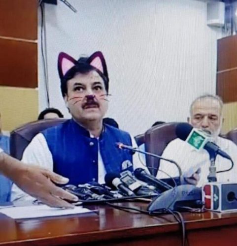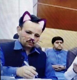 巴基斯坦开柏普赫图赫瓦省内阁上周五(14日)举行记者招待会,来自巴基斯坦正义运动(PTI)的政客尤萨夫赞(Shaukat Yousafzai)正严肃讲解政事,但突然开启了“猫咪滤镜”功能,黑色的猫耳、鼻子、胡子及腮红,把他显得很可爱,令他与气氛严肃的记者会相当不符,让在观看直播的网民啼笑皆非。