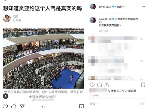 有网友PO出一张炎亚纶在大陆郑州的购物商场举办活动的照片,只见现场人山人海,一楼到三楼都挤满了人潮,并且随处可见挂着应援他的布条,该网友更发文写道:“今天在郑州万达的活动图,没什么其他的意思,就是好奇他现在还这么火吗?”