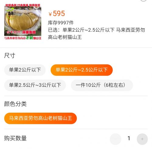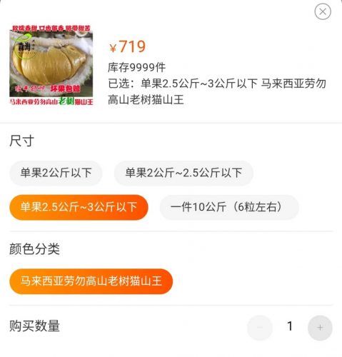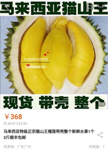 据了解,从广州发货的猫山王,一颗若重3斤(1.5公斤),要价人民币368元(222令吉),4斤到5斤以下的要595元(360令吉),最贵的5斤到6斤一粒的,要价高达719元(430令吉)。