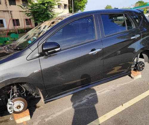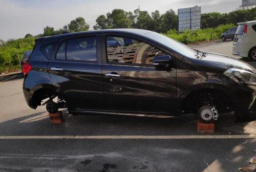 两名受害者同样是把新Myvi停在路旁时,取车才发现四粒轮胎都被偷走了,剩下砖头在支撑着车子。