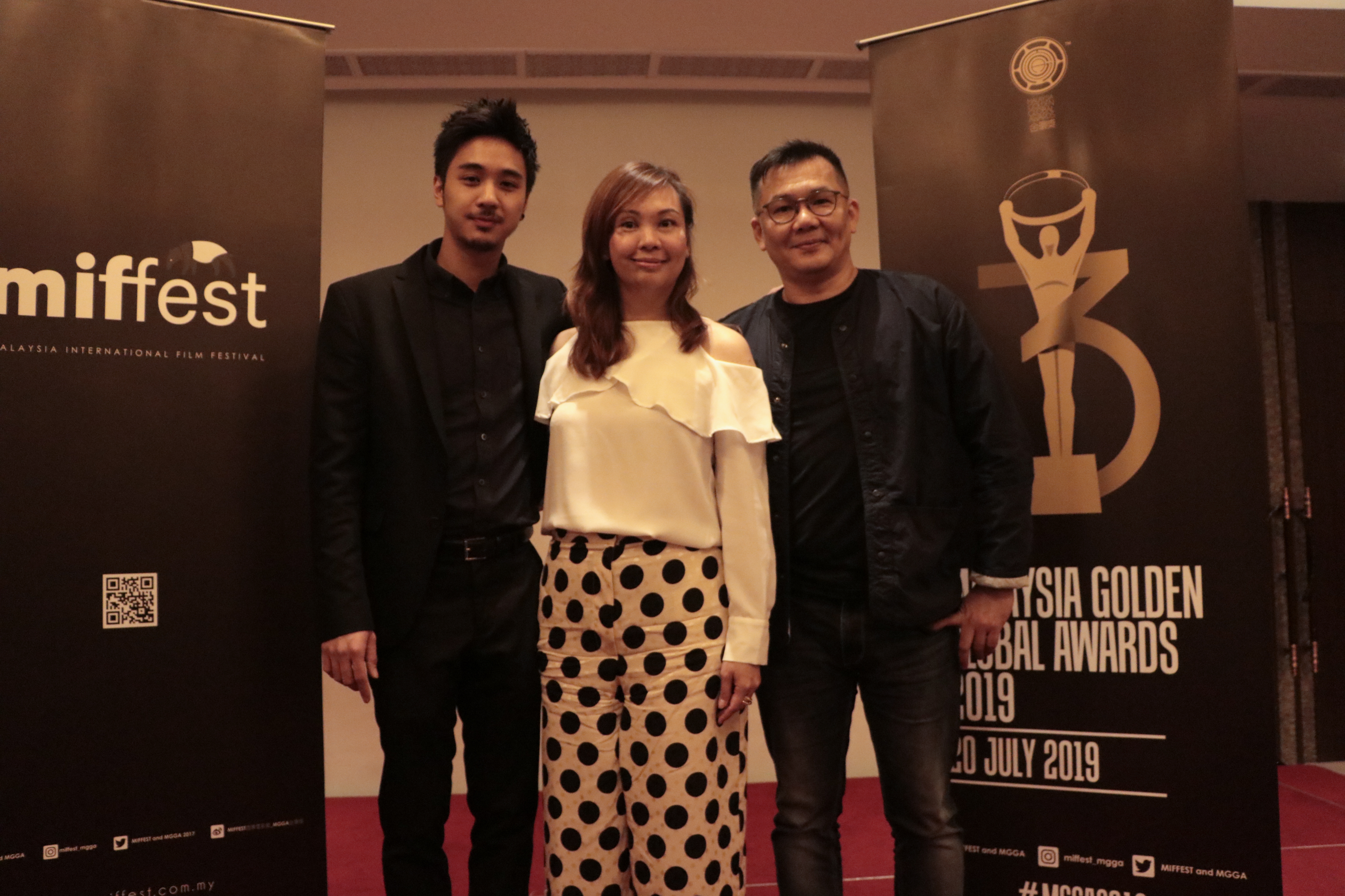 吕杨(左起)、吴佩玲和郑雄城在记者会上公布《第三届马来西亚国际电影节观摩影片暨金环奖》入围名单。