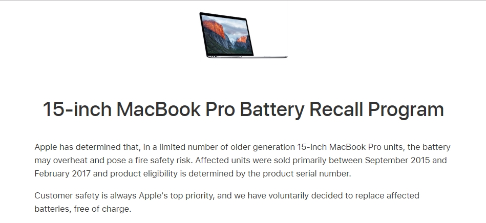 苹果说,由于部分旧款的 MacBook Pro 机型电池恐引发电池过热起火,因此建议用户更换电池。