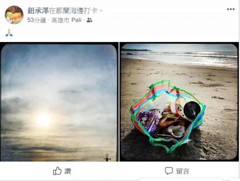 钮承泽趁着生日期间到了都兰海边打卡,不过仅用两张景物照,并未留下文字,仅用双手合十的表情符号,其中一张环保袋中更有着满满的垃圾及杂物。他本人也在更新的封面照片中微笑露脸,并提着打卡照片中的环保袋,疑似到海边净滩。