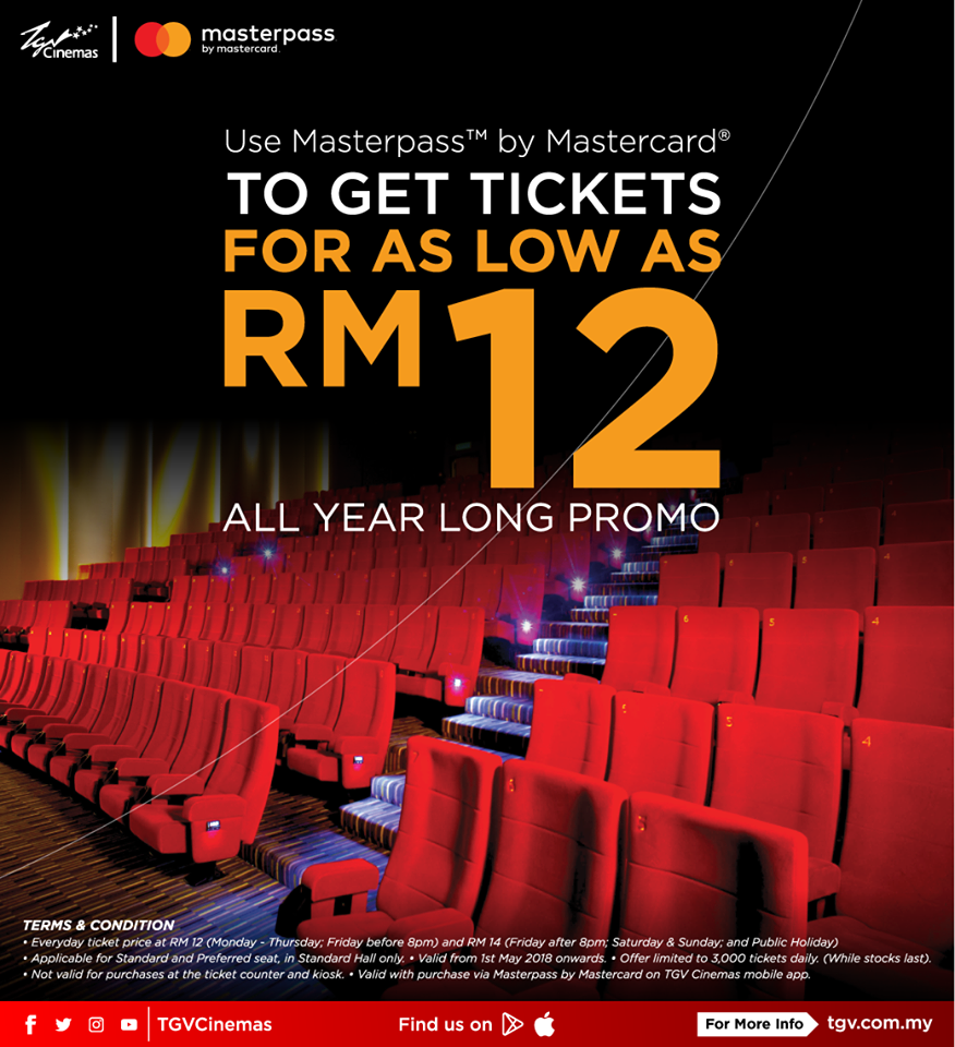 即日起TGV电影票只需RM12 3 May , 2018 | 吃喝玩乐 从即日起,前往TGV电影院购买戏票的只需RM12! 你只要使用Masterpass by Mastercard购买TGV电影票,即可享有RM12的特价优惠(星期一至四、星期五8点前);星期五8点后、星期六、日及公共假期则RM14。 什么是Masterpass?简单来说,就是你只要在TGV电影院的应用程序中,绑定Mastercard信用卡或转账卡,并使用它来购买电影票就可以了。 分享