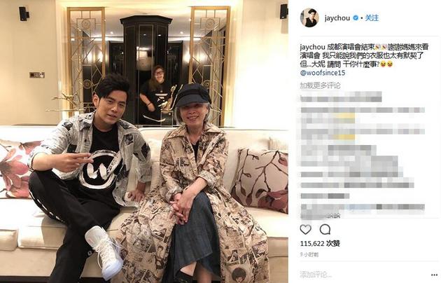 周杰伦成都演唱会圆满落幕,周董在社交Instagram账号上晒出与妈妈叶惠美的合影,表示“谢谢妈妈来看演唱会,我只能说我们的衣服也太有默契了”,还不忘cue身后的助理“但…大妮,请问干你什么事?”笑其抢戏。