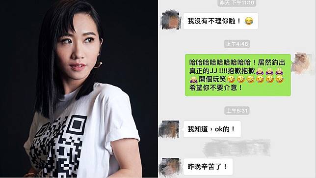没想到这个桥段竟成功钓出JJ本人,Lulu昨天(30日)在脸书上晒出JJ和她的私讯截图,林俊杰在典礼当晚11点10分就私讯Lulu表示“我没有不理你啦!”并附上一个哭笑不得的表情图案,Lulu忙完典礼半夜4点多回覆对方:“哈哈哈哈哈哈哈哈哈!居然钓出真正的JJ!!!抱歉抱歉,开个玩笑,希望你不要介意。”JJ随后也暖心回应“我知道,ok的”、“昨晚辛苦了”。
