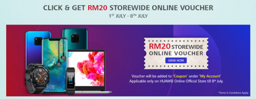 此外,华为用户在活动期间,也可获得送出RM20折扣劵!你只要点击RM20 Storewide Online Voucher即可领取!不过需要注意的是,RM20折扣劵只限7月8日前使用!