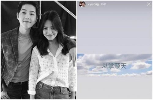 接着一张据传是从宋仲基父亲手机中流出,去年9月宋慧乔为宋仲基亲密庆生照也在韩网疯传,打脸双宋去年9月感情不和分居传闻。然而奇怪的是,宋仲基曾在北京大学学习中文7年的哥哥,此时却突然在社群网站以中文写下“以掌蔽天”4字,暗指有人一手遮天,宋仲基哥哥此举也被认为是写给宋慧乔经纪公司与力挺宋慧乔的中国粉丝看的。