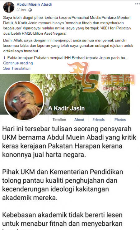 他批评卡迪耶欣,作为一名受人敬仰的首相办公厅媒体顾问,必须以专业和成熟的方式,回应所有公共大学讲师的提问,而非只会在脸书发表帖文。