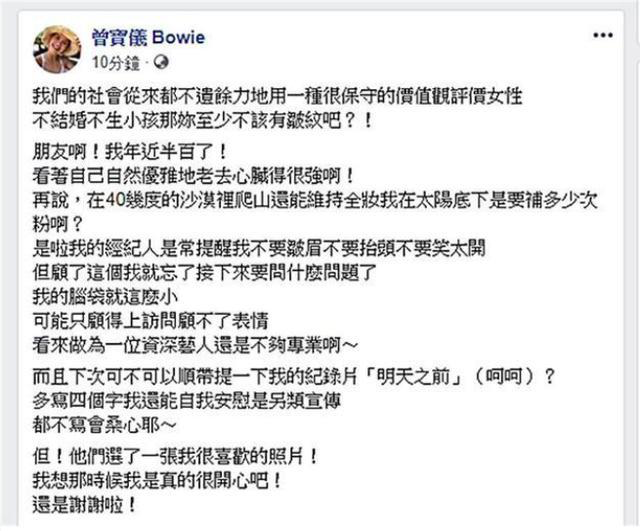 46岁的曾宝仪近照曝光,皱纹横生,老态明显,被网友嘲笑越来越像父亲曾志伟。曾宝仪被网友嘲笑后,也发文为自己辨解,她说在世人的眼里,不结婚不生孩子的女人似乎就不应该老,但她都已年过半百了,看着自己优雅地老去心脏得多强?