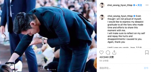 TOP退伍后首度发文:给粉丝带来伤痛失望很抱歉 8 Jul , 2019 | 娱乐前线 BIGBANG崔胜贤通过社交网站向粉丝表达了歉意和感谢,“虽然我无法堂堂正正的面对自己,但想对帮助我度过这一瞬间的粉丝们表示深深的感谢,以后将继续反省,会怀着因给粉丝带来伤痛和失望而抱歉的心情生活。” 据悉,韩国天团BIGBANG成员T.O.P于2017年2月入伍,期间却爆出吸大麻负面新闻,形象一落千丈。他年初被分配到首尔龙山工艺馆,以“社会服务要员”身份完成剩下的兵役,6日晚间7点终于正式退伍。 分享