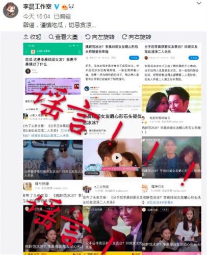 范冰冰和李晨上月底先后发文,宣布退回朋友关系,但他们分手3天后就被拍到一起吃饭,因此被猜可能是为了女方復出炒作而假分手,原因众说纷纭,而今又爆出分手导火线是李晨有了新女友,新欢甚至还在网上PO出“心形石头”挑衅范冰冰。对此,李晨工作室稍早贴出一“打假图”,并发文:“辟谣,谨慎吃瓜,切忌贪凉”,否认有新欢传闻。