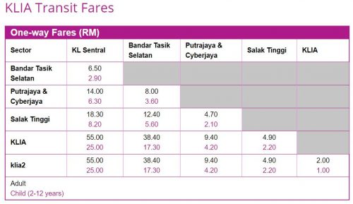无论是搭去KLIA或KLIA 2,成人的车票都只是RM4.90,2至12岁的儿童票价RM2.20,55岁以上的乐龄人士则为RM3.40。
