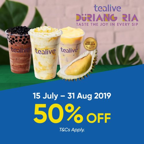 想要喝到满满的D24榴莲果肉的饮料吗?Tealive有提供50%折扣! 10 Jul , 2019 | 吃喝玩乐 好消息!购买Tealive榴莲Duraing Ria饮料可获得50%折扣! 随着榴莲季节的到来,Tealive又推出限定饮料榴莲Duriang Ria啦!充满榴莲香味的Duriang Ria带有满满的D24果肉,肯定能满足榴莲控的欲望!重点,Tealive还推出50%折扣,简直是太爽啦! 这项促销从7月15日至8月31日,在全马各分店进行!不过需要注意的是,所有的顾客需使用TNG电子钱包进行付款,方可获得! 此外,这项促销限定首150,000,所以想喝的朋友记得要趁早咯! 分享