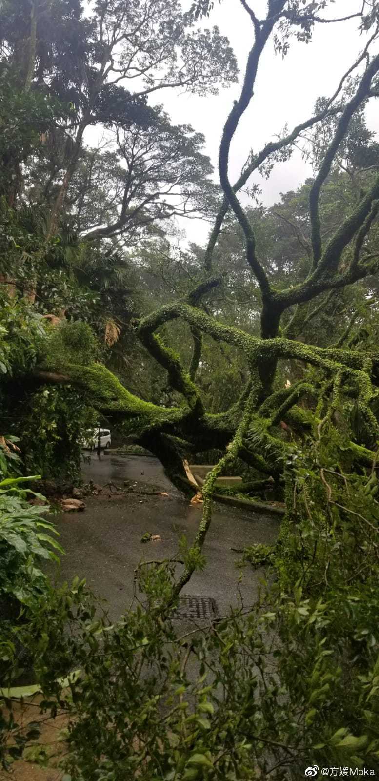 方媛10日晚上在微博发文提到,“一棵树突然倒了,被困在山顶的5个小时,此时此刻好饿~借美景拍了几张照片(这棵树可真美),听说这棵树一时半会弄不走”,还拍到那棵倾倒在路边的大树,并不忘附上自己的美照。