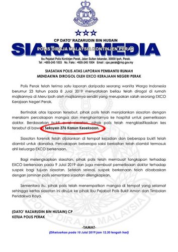 不过,霹雳州总警长纳沙鲁丁昨日已宣布,随着女佣已验身,警方根据初步证据,将“杨祖强被指控性侵”案件列为强奸案调查。