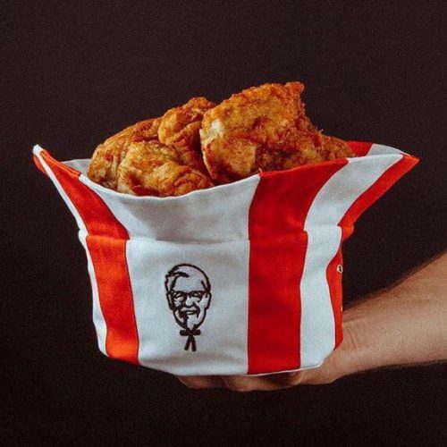 这款渔夫帽以肯德基经典的红白色为主,再配上两家品牌的标志性logo,包括桑德斯上校(即肯德基老爷爷)的样貌及MamCupy字眼!它最有趣的地方是,当你把帽子戴在头上时,这两个标志是上下颠倒的,只有把帽子倒立放,开口朝上肯德基爷爷才会正脸对你!