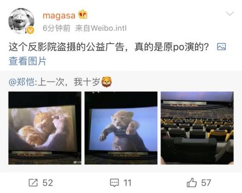 演员郑恺发布微博,晒出自己在观看迪士尼新片《狮子王》时的照片,表示上一次观看动画版《狮子王》时,自己仅10岁。这条微博却意外引发热议:因郑恺将影院播放的《狮子王》预告拍摄下来,并po上微博,让这位曾推广文明观影行为的大使背上“盗摄”嫌疑。