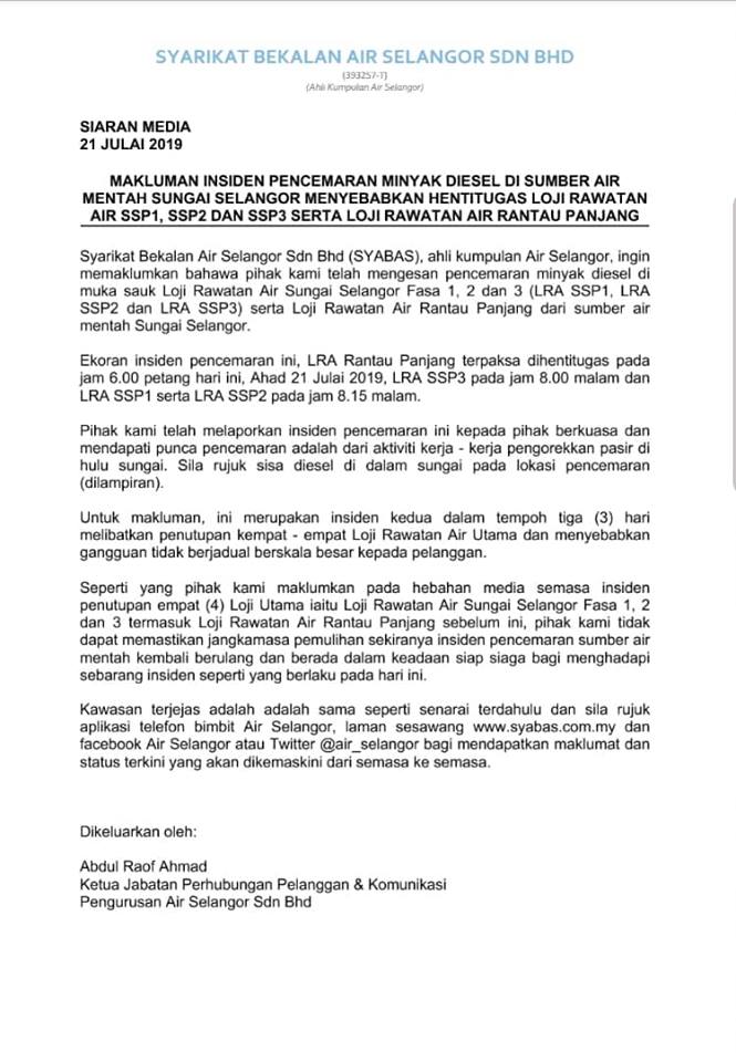 雪州水供公司(SYABAS)在星期天晚上9时30分在脸书发文告,指雪兰莪河遭到柴油污染,当局又再紧急关闭雪河第一期、第二期、第三期以及Rantau Panjang滤水站。