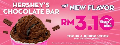 除此之外,Baskin Robbins也推出了全新口味的雪糕Hershey’s Chocolate Bar!配合新口味的推出,Baskin Robbins也将会提供优惠!你只要购买任何1scoop的雪糕,即可以RM3.10 top up Hershey’s Chocolate Bar雪糕了!