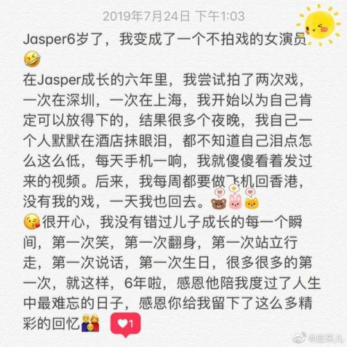 7月24日,应采儿也发博感叹:“Jasper 6岁了,我变成了一个不拍戏的女演员,在Jasper成长的六年里,我尝试拍了两次戏,一次在深圳、一次在上海,我(一)开始以为自己肯定可以放得下的,结果很多个夜晚,我自己一个人默默在酒店抹眼泪,都不知道自己泪点怎么这么低,每天手机一响,我就傻傻看着发过来的视频。”