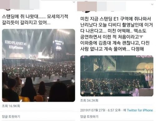 有粉丝在社交网分享现场短片,指台下有老鼠出没,吓得附近观众发出阵阵尖叫,并指有工作人员在捉老鼠,但很像没有抓到。而EXO成员在台上看到此事后也大感慌张,队长Suho随后安抚粉丝说:“有老鼠也可能有昆虫,本以为是昆虫,还想安慰大家说因为EXO-L是花,有昆虫也不足为奇,没想到竟然出现老鼠。”