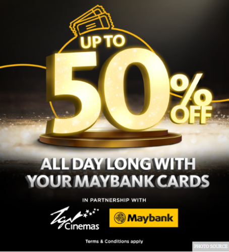 这项促销只限Maybank Debit/Credit Card用户!凡星期六前往TGV购买Standard或IMAX戏票,即可享有50%折扣!不过需要注意的是,用户需通过Maybank Debit/Credit Card在官网、柜台进行付款!