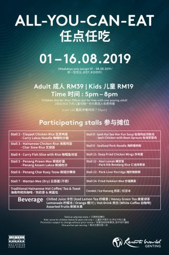 这项活动从即日起至8月16日,在云顶美食街举办!参与的摊位多达10个,他们提供的美食选择多样化,包括瓦煲鸡饭、怡保鸡丝河粉汤、仁当排骨饭、椰浆饭、槟城炒果条、云吞面、炒福建面、槟城虾面、红豆冰、海南传统热咖啡等等!