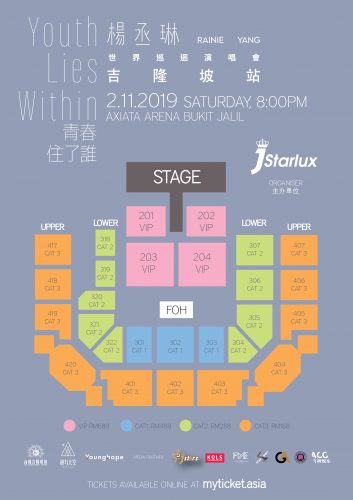 这场由Jstarlux主办的杨丞琳《青春住了谁》世界巡回演唱会吉隆坡站,门票将于8月8日,上午11点,透过网购方式www.myticket.asia正式公开发售,每人每次可购买最多6张门票。演唱会票价分为,RM688、RM488、RM288、RM168(自由入座)*未加RM4手续费。欲知更多演唱会详情,可浏览JStarlux官方脸书。