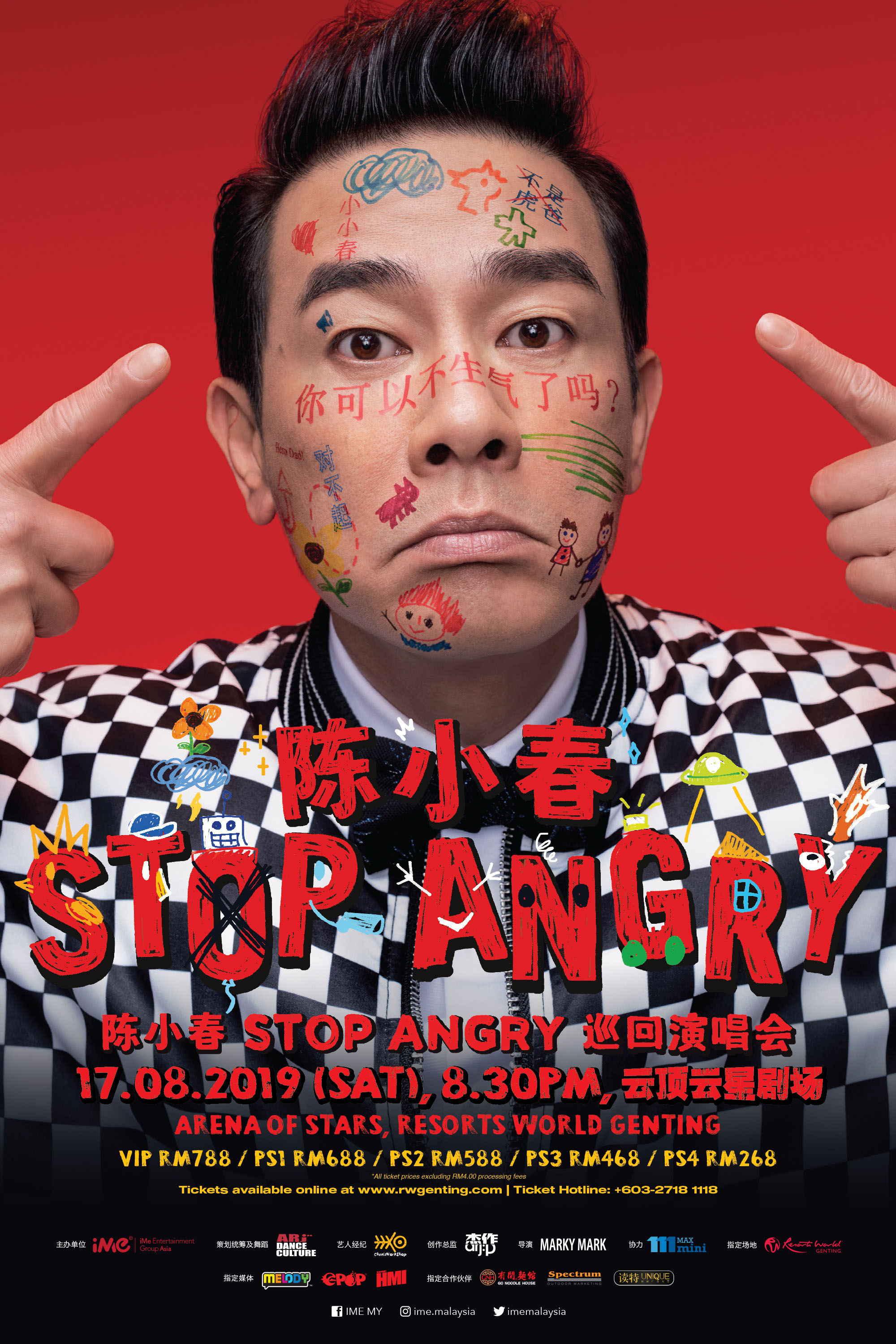 这场由iMe主办的陈小春《STOP ANGRY》巡回演唱会马来西亚站,将于2019年5月21日(星期二),中午12时正式公开发售。票价分为RM788、RM688、RM588、RM468和RM268(所有门票不包含RM4手续费)。欲知更多演唱会详情,请拨电+603-27181118或浏览www.rwgenting.com。