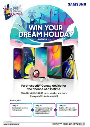 这里有好消息要告诉大家!那就是配合国庆日的到来,马来西亚三星电子决定送出价值RM10,000的旅游礼劵予新的用户!从即日起至9月16日,凡购买指定三星产品,包括Samsung Galaxy S10、Samsung Galaxy Note9、Samsung Galaxy A系列等,即有机会赢得奖品!