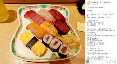 浩子第一站带家人飞往日本度假,孩子专心玩机台,老婆则负责在背后看守,独自在新宿吃午餐,握寿司端上桌后,他难得有时间和自己对话:“亲爱的自己,呼…我们俩个人好久没有聊聊天了,ㄜ…应该是说,我们一个人,好久没有聊聊天了…。”