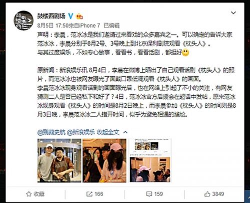 鼓楼西剧场微博更说,有时间聊八卦,不如认真做事,看书、看话剧都比说长道短的好,网友则回说:“别cue美女,美女很忙”、“我冰独自美丽勿造谣”、“李晨在剧组抽时间过来给捧场,就别给他造谣了”、“不捆绑,谢谢”。