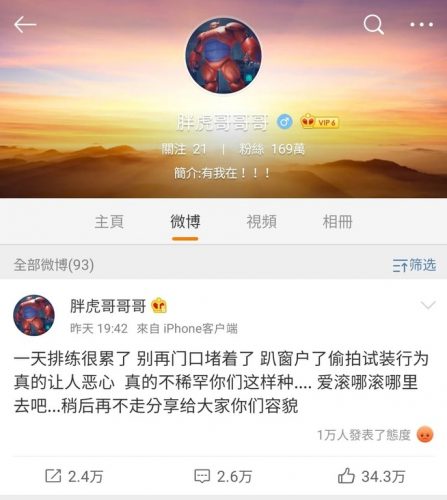 易烊千玺的助理8日晚间在微博发文,斥责私生饭太过分:“一天排练很累了,别在门口堵着了,趴窗户偷拍试装行为真的让人恶心,真的不稀罕你们这种……”他更警告粉丝不要再继续干扰,“爱滚哪滚哪里去吧…稍后再不走分享给大家你们容貌!”
