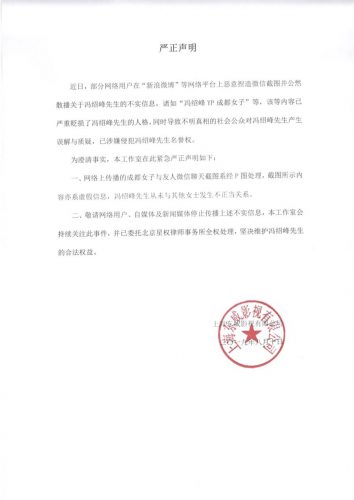 冯绍峰的工作室稍早发出声明回应绯闻,强调“网络上传播的成都女子与友人微信截图系经P图处理,截图所示内容亦系虚假信息,冯绍峰先生从未与其他女士发生不正当关系” ,并要求所有网友、自媒体、新闻媒体停止散布不实讯息,工作室已委托律师处理此事,未来不排除提告,火速否认出轨八卦。