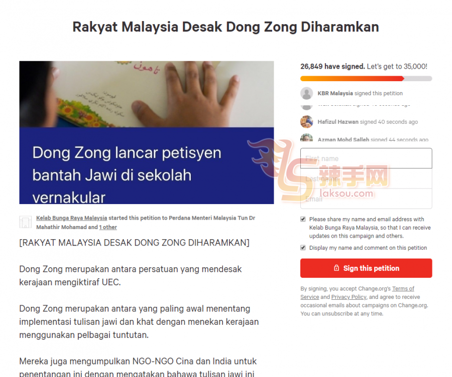 这项由大红花俱乐部(Kelab Bunga Raya)所发起,题目是“大马人民促请董总被禁止”。