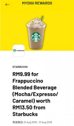 Digi用户只要打开MyDigi应用程序,点击Reward选项,然后点Starbuck Frappuccino即可!在成功领取促销劵后,你只要前往临近的分店,向员工出示就能以RM9.99的价格购得!除了Genting Highlands Stores、Sunway Lagoon Kiosk、Bangsar LRT Station、Tapah R and R及Masjid Jamek LRT Station,其他分店均有提供!