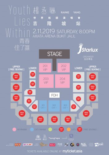“全能天后”杨丞琳《青春住了谁》世界巡回演唱会吉隆坡站2个票价CAT2(RM288)与CAT 3(RM168)门票已售罄!
