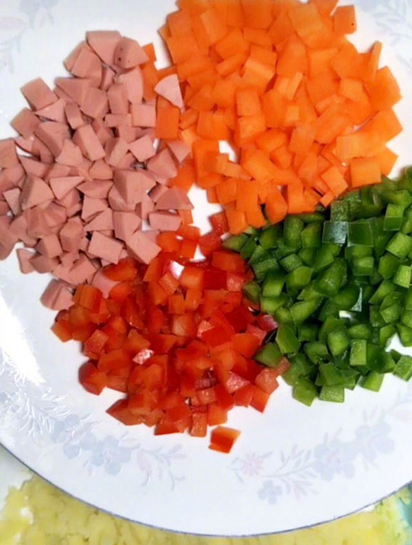 2.先把煮熟的土豆碾压成泥,胡萝卜、青椒、红椒分别洗净切丁,火腿肠切丁