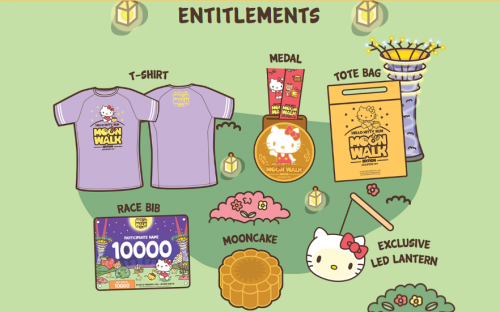 凡报名参加Hello Kitty Rnn Moon Walk 2019年竞跑活动,即可获得一件紫色的活动衣、Hello Kitty奖牌包包和Hello Kitty的LED灯笼!另外,首6000名报名的参与者还Hello Kitty月饼!