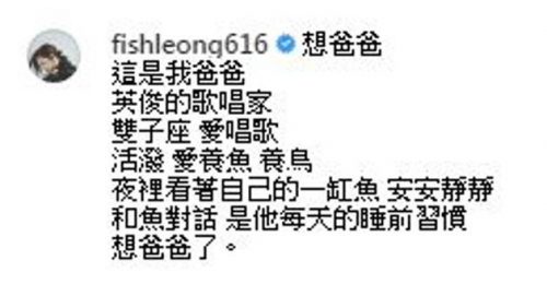 之后她再次出Po留言表示惦记已故的父亲:“想爸爸,这是我爸爸,英俊的歌唱家,双子座爱唱歌,活泼爱养鱼养鸟,夜里看着自己的一缸鱼,安安静静和鱼对话,是他每天的睡前习惯,想爸爸了。”爸爸是孩子成长过程中,担任保护的角色,就算长大之后遇到困难的时刻,自然也会想起爸爸,梁静茹从言词间透露出愁绪,但对离婚一事仍只字未提,心情似乎仍然未平复。