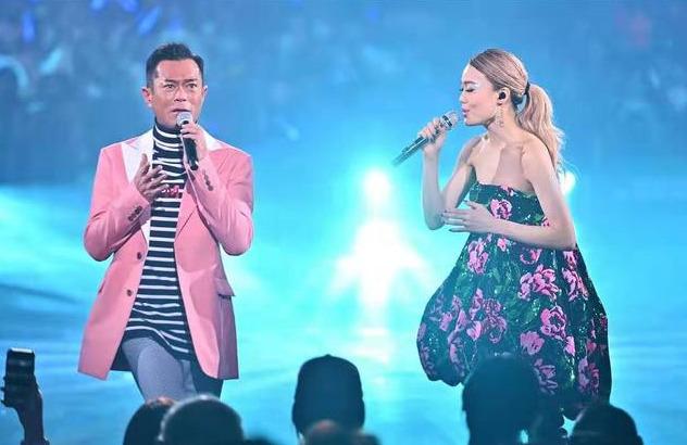 古天乐突然说戴了耳机,听不到现场声音,主动要求重唱一次《今期流行》,说完后看到容祖儿愕然表情:“怎么呀,你怕了,你不是也加了场啦。”容祖儿笑说,“不怕,这个人真的是喜欢唱歌!”