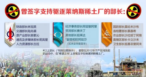 2013年,关闭稀土厂纳入了希盟前身—民联的大选竞选宣言中,当年的“505全国大选”,上述15人都身处民联并披甲上阵,虽执政不了都还不至于不了了之,直到509大选,竞选宣言虽一字不提,但希盟领袖的口中却一再提及。
