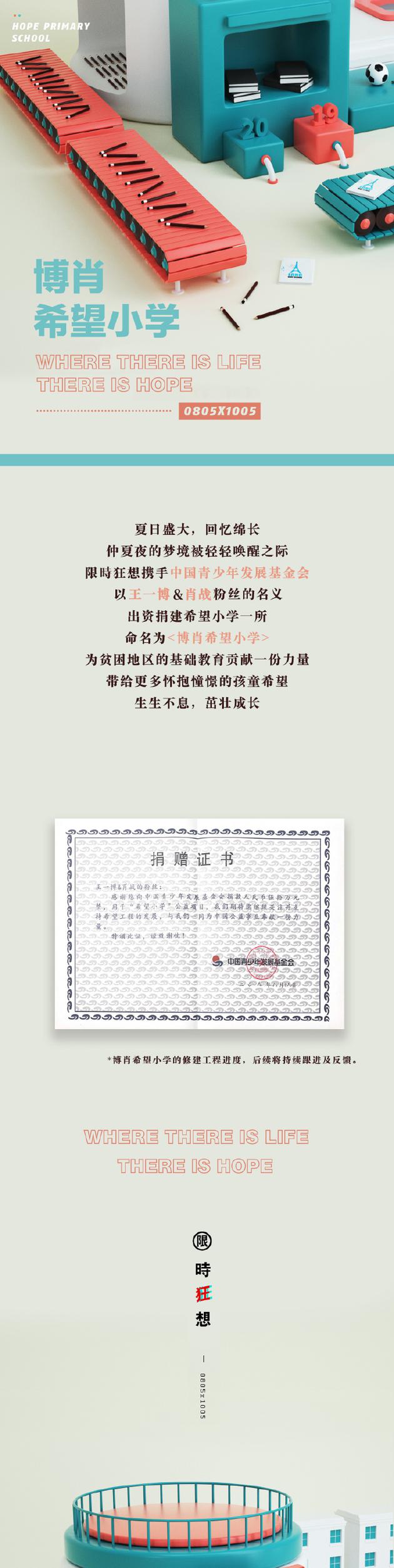 强!粉丝以肖战王一博名义捐建希望小学 22 Aug , 2019 | 娱乐前线 肖战和王一博的粉丝以两人名义捐建了一所希望小学,发微博称:“昨路无愧,感怀一颗真心。明日璀璨,愿抔一份微光。限时狂想通过中国青少年发展基金会捐建一所希望小学,命名为【博肖希望小学】。把我们的故事延续,给未来更多的色彩。把我们的深情延续,给孩子更多的希望。不忘初心、保持热爱、永远无忧。 ” 前有饭圈女孩被新闻联播点名表扬,现有追星粉丝捐建希望小学回报社会。弘扬正能量,不忘初心,许多网友感慨:“这才是追星的正确打开方式,为她们点赞!” 分享