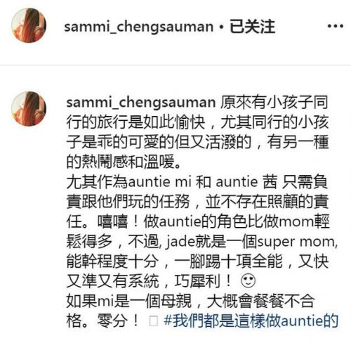 郑秀文分享带娃感言 自嘲是“零分妈妈” 26 Aug , 2019 | 娱乐前线 郑秀文在社交网站上晒出一张四人合照,照片中,有雷颂德妻子梁家玉,还有张卫健妻子张茜及小朋友。一行人英国游玩,开心十足。 郑秀文还分享了与小朋友同游的感受:“原來有小孩子同行的旅行是如此愉快。”小孩子可爱、活泼、乖巧的一面令她感到热闹和温暖,她很享受这种只陪孩子游玩,不存在照顾及责任的状态。她又称赞好友梁家玉是一个尽职的妈妈,完全可以拿十项全能。最后,她认为自己是一个不合格的母亲,只能拿零分。疑似自嘲自己没有小孩子的遗憾。 分享